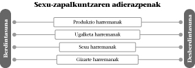 Feministak lau harreman-arlo horietan borrokatu dira bi ikuspegi desberdinetatik: batetik, berdintasuna eta sexuak parekatu beharra aldarrikatuz; eta, bestetik, emakumetasunaren funtsezko oinarriak eta desberdintasunak aldarrikatuz.