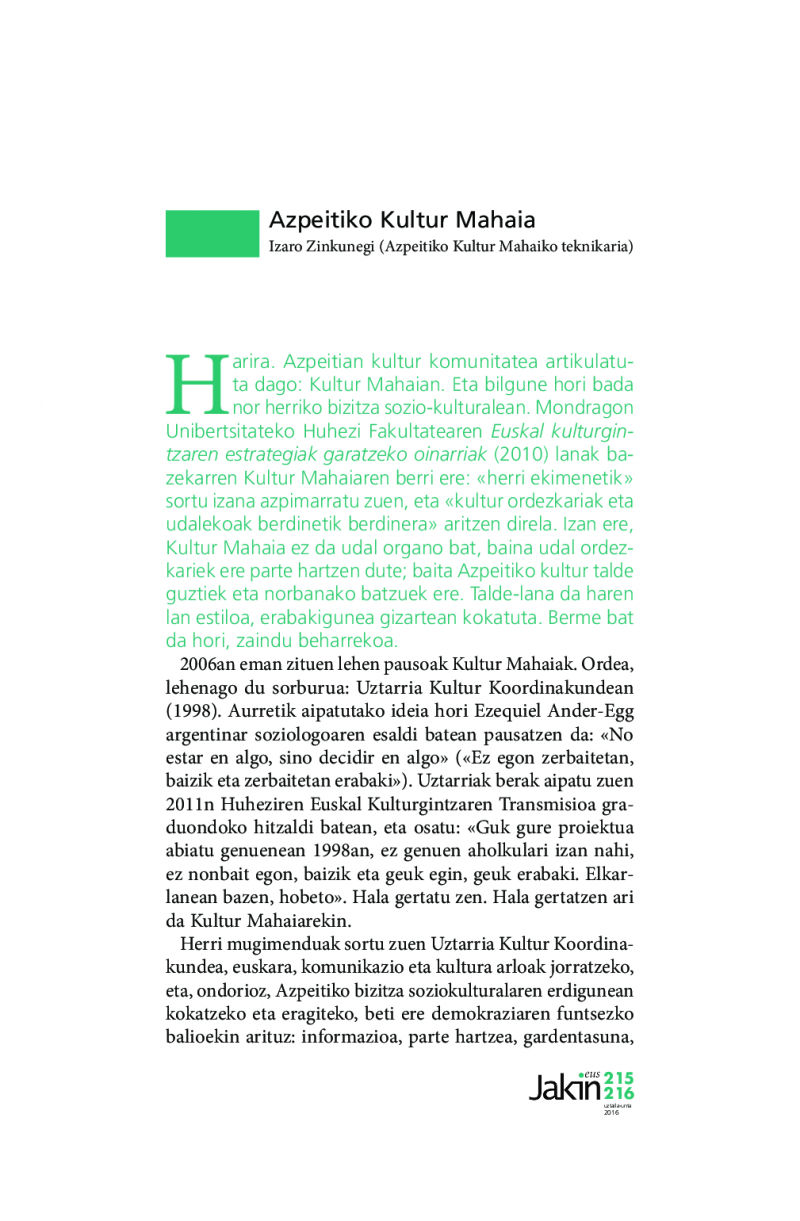 Zazpi kultur egitasmo aurkezten dira, ezberdinak filosofia, izaera eta jardunbideari dagokienez, baina denak ongi errotu eta onartuak euskal kulturaren panoraman: Tabakalera (Ane Rodriguez), Astra (Leire Lopez Ziluaga eta Oier Plaza), Azpeitiko Kultur Mahaia (Izaro Zinkunegi), Katakrak (Nerea Fillat), Euskal Herria Zuzenean (Pauline Guelle), Hala Bedi Irratia (Gaizka Amondarain) eta Okela Sormen Lantegia (Nora Aurrekoetxea, Izaro Ieregi eta Irati Urrestarazu). Artikuluek puntu hauek jorratzen dituzte: egitasmoaren filosofia, funtzionamendua eta gobernantza, sortzaile, eragile eta erakundeekin harremanak eta euskara eta euskal kulturari buruzko ikuspegia.