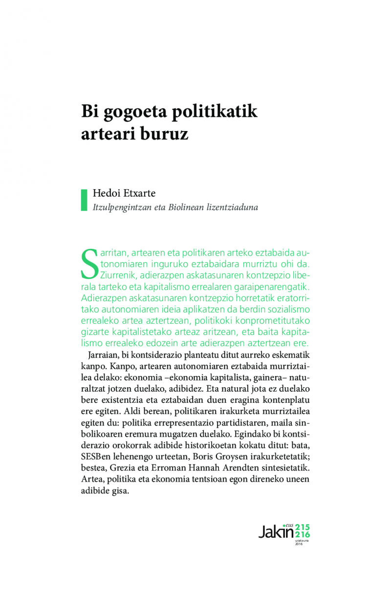 Artearen eta politikaren arteko eztabaida autonomiari buruzkora murriztetik harago, arte, politika eta ekonomiaren arteko tentsioa aztertzen da bi adibide historikotatik abiatuta: SESBen lehen urteak Groysen arabera, eta Grezia eta Erroma Arendten sintesietatik.