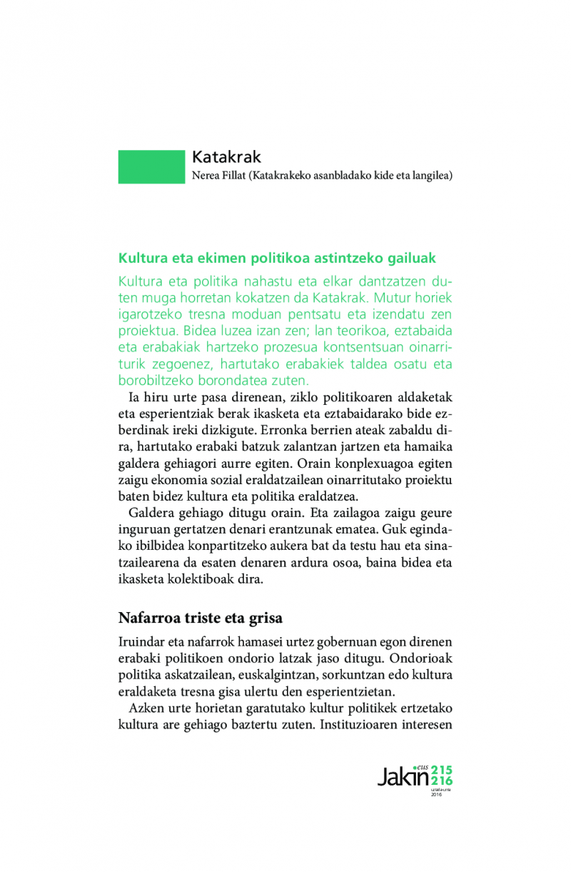 Zazpi kultur egitasmo aurkezten dira, ezberdinak filosofia, izaera eta jardunbideari dagokienez, baina denak ongi errotu eta onartuak euskal kulturaren panoraman: Tabakalera (Ane Rodriguez), Astra (Leire Lopez Ziluaga eta Oier Plaza), Azpeitiko Kultur Mahaia (Izaro Zinkunegi), Katakrak (Nerea Fillat), Euskal Herria Zuzenean (Pauline Guelle), Hala Bedi Irratia (Gaizka Amondarain) eta Okela Sormen Lantegia (Nora Aurrekoetxea, Izaro Ieregi eta Irati Urrestarazu). Artikuluek puntu hauek jorratzen dituzte: egitasmoaren filosofia, funtzionamendua eta gobernantza, sortzaile, eragile eta erakundeekin harremanak eta euskara eta euskal kulturari buruzko ikuspegia.