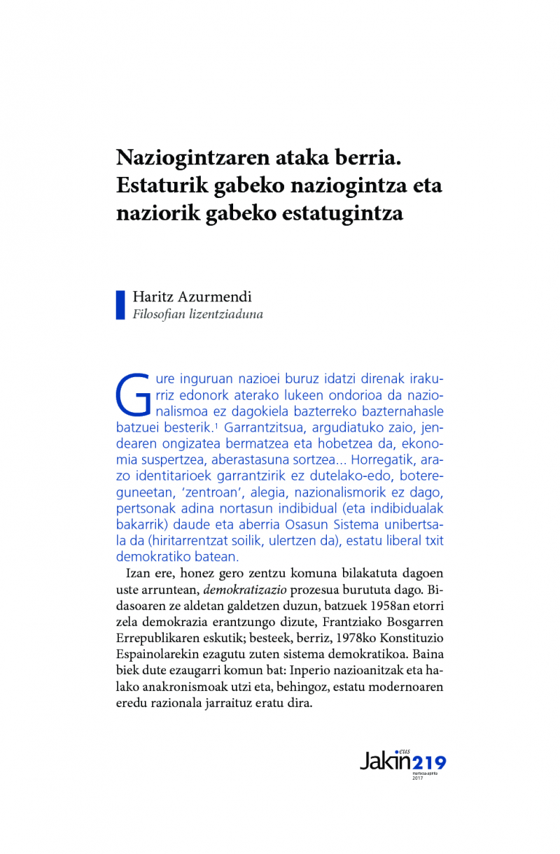 Azken mendeetan batera joan diren naziogintzaren eta estatugintzaren irakurketa bat egiten da, batez ere autore klasikoetan oinarrituz; ondoren, sintesi horren arazoak azaldu eta bi prozesuek autonomoki izan ditzaketen bideei buruz gogoeta laburra egiten da.