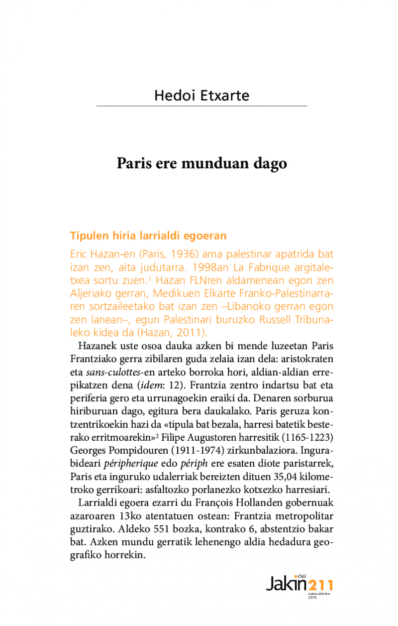 Hedoi Etxartek Parisko atentatuak –urtarrilean Charlie Hebdo aldizkariaren aurka eta azaroan hiriburuko hainbat leku publikotan egindako erasoak– ditu gogoeta gai, Mendebaldearen kontzientzia inarrosi duten gertakariak, zalantzarik gabe. Fanatismo erlijiosoaren azpian daude bestelako gako soziopolitikoak agerian uzten saiatzen da Etxarte.