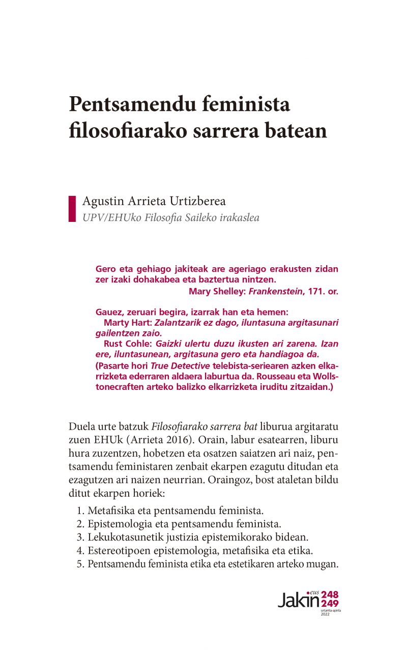 Filosofiarako sarrera bati begira, pentsamendu feministatik egin diren ekarpen batzuk aurkezten dira. Zehatzago, ‘errealitatea’ ordenatzeko edo sailkatzeko moduari eta etikaren eta estetikaren arteko mugari lotutako zenbait auzi jorratzen dira.