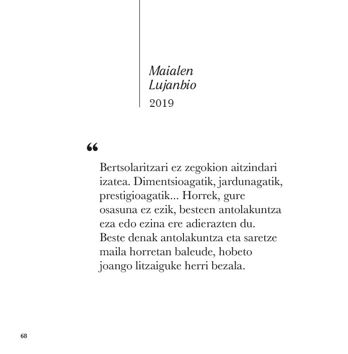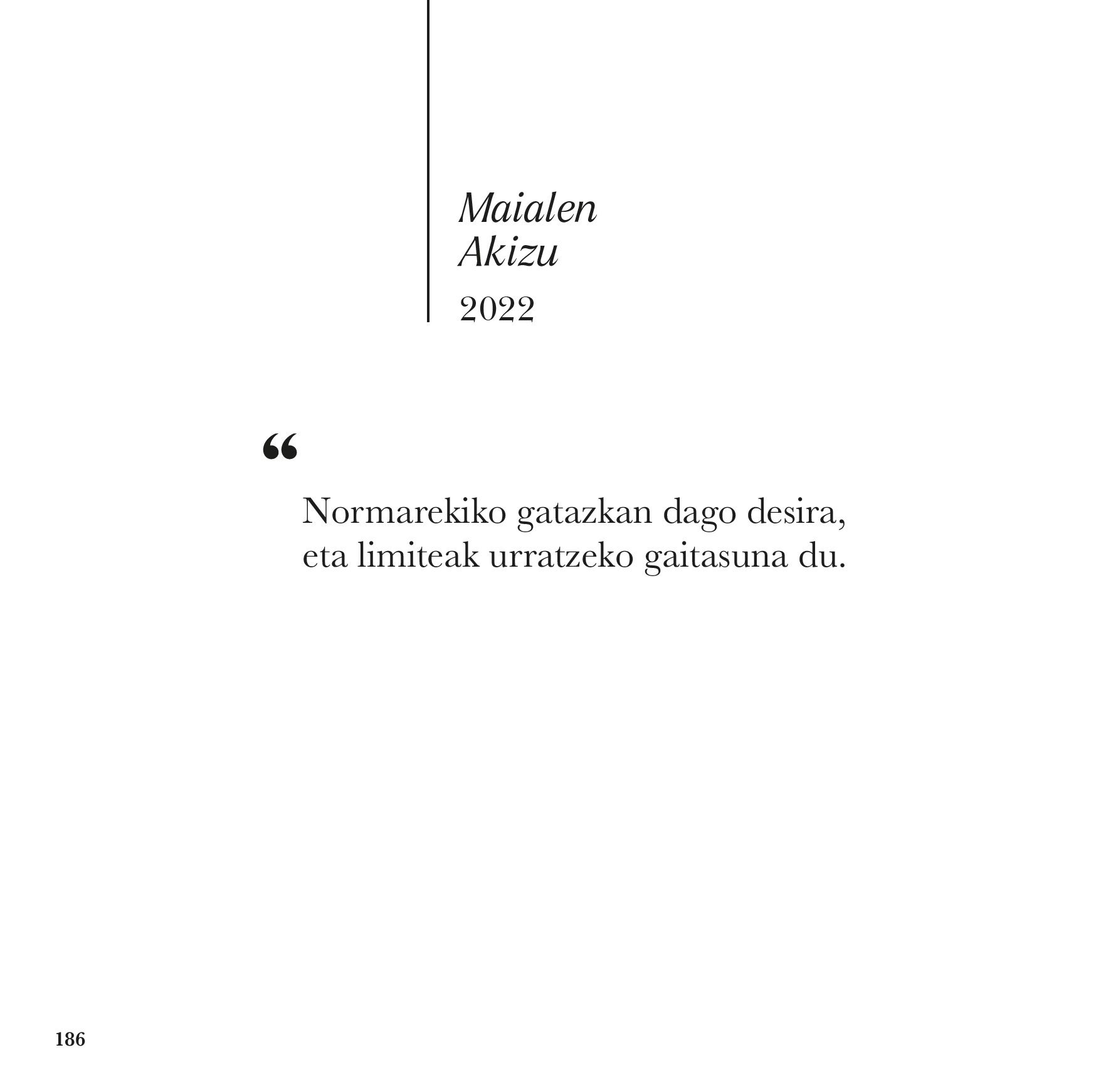 «Normarekiko gatazkan dago desira, eta limiteak urratzeko gaitasuna du». Akizu, Maialen (2022). 'Kultura', Jakin 252, 139-144. Maialen ...