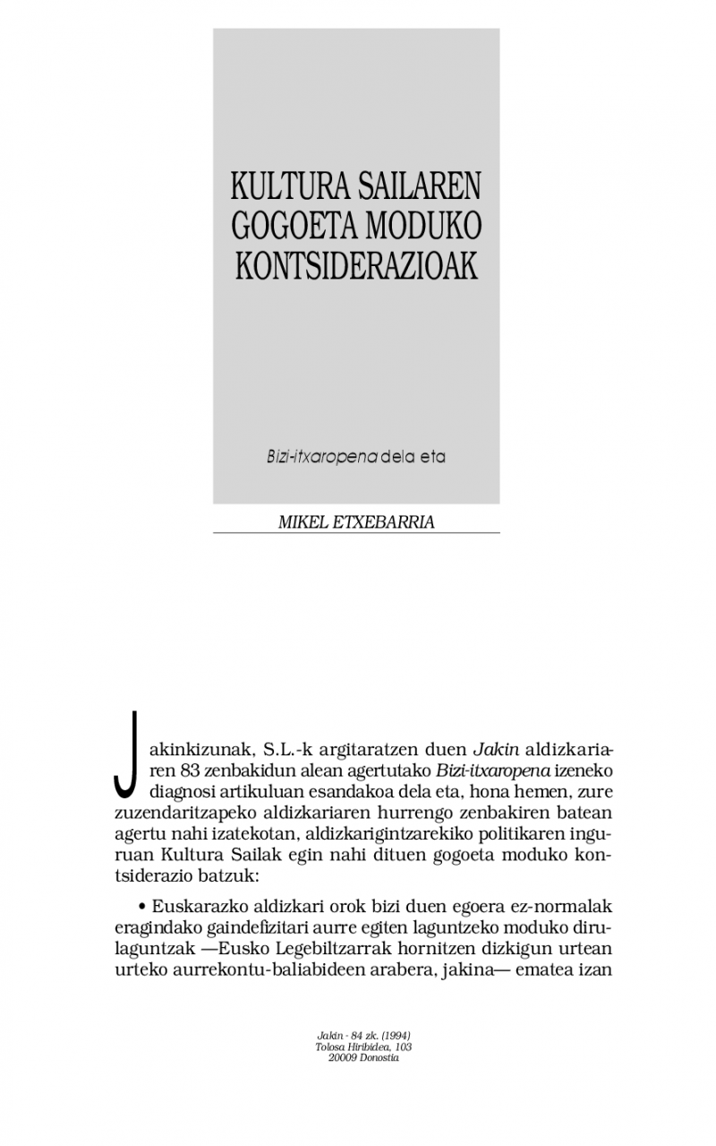 Kultura Sailaren gogoeta moduko kontsiderazioak. «Bizi-itxaropena» dela eta