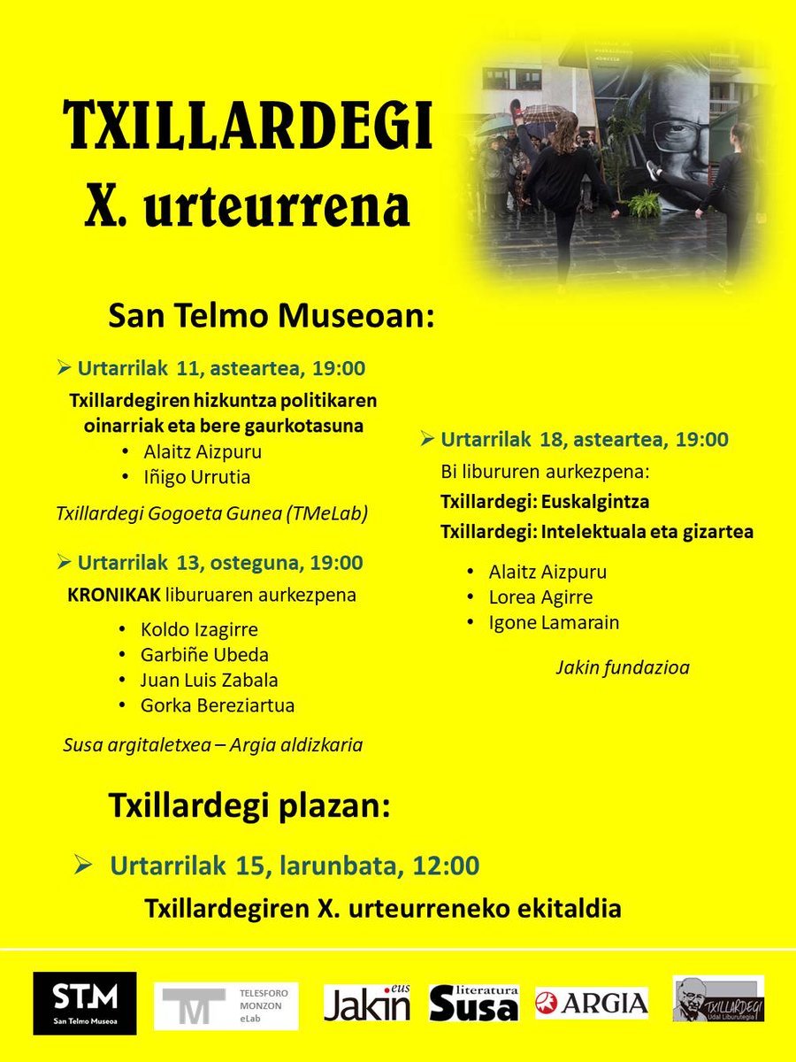 - Urtarrilak 11, asteartea 19:00etan San Telmo museoan: ‘Txillardegiren hizkuntza politikaren oinarriak eta bere gaurkotasuna’ hitzaldia (Txillardegi Gogoeta Gunea, TMeLab)